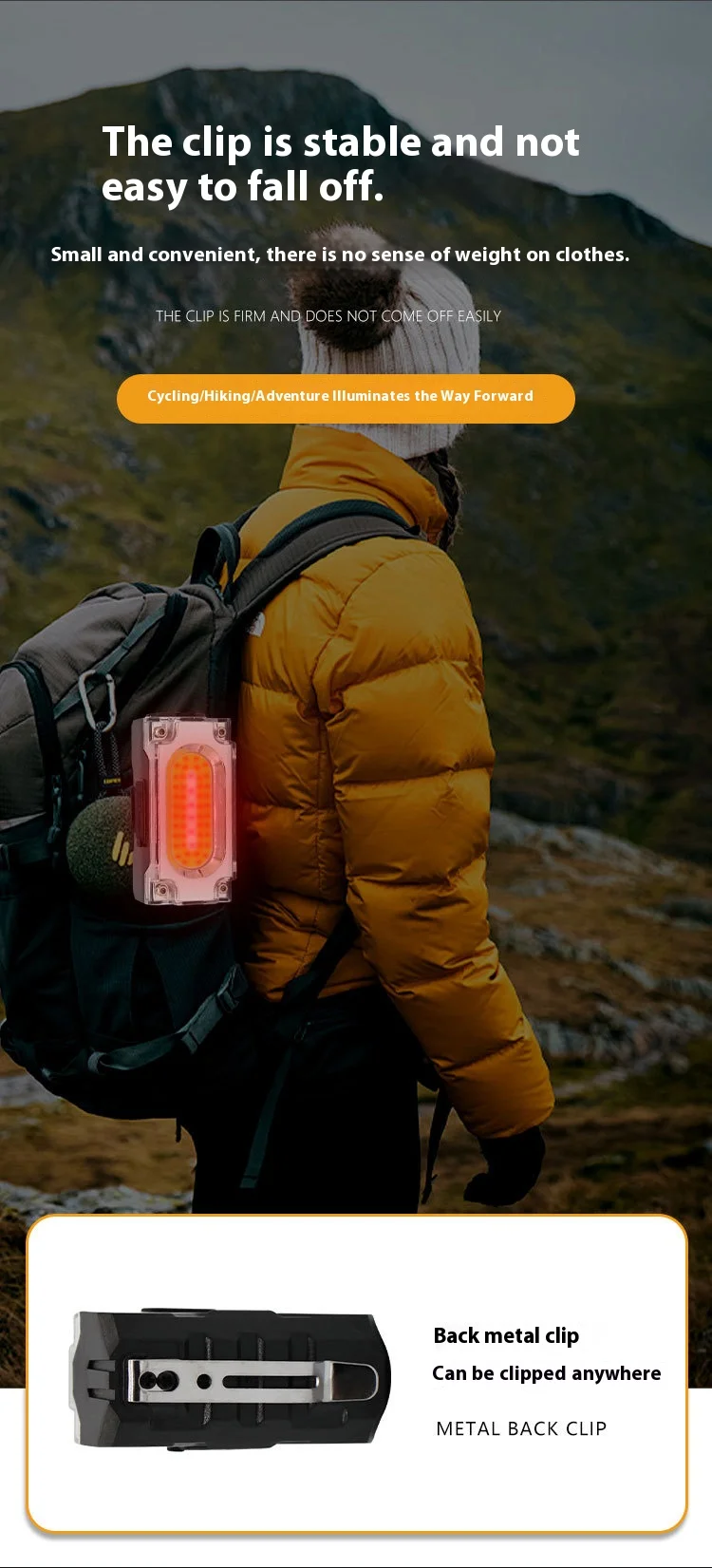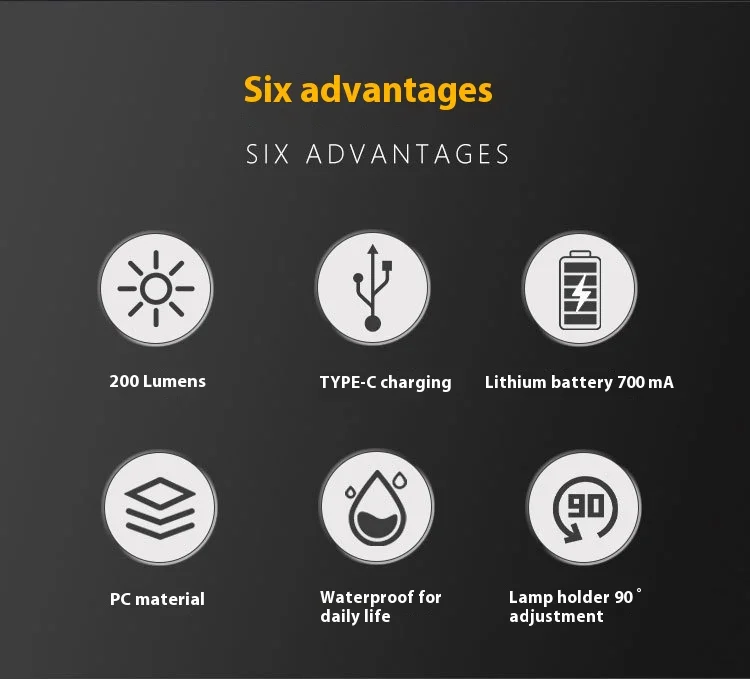 – Разполага с 200 лумена светлинна мощност, 6 режима на светене (бяла, жълта и червена светлина), магнитна основа и стабилен клипс за шапка.