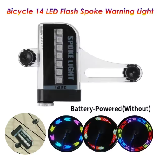 – LED светлина за спици на велосипед с 14 ярки диода и 30 цветни ефекта, които се сменят автоматично по време на движение.
