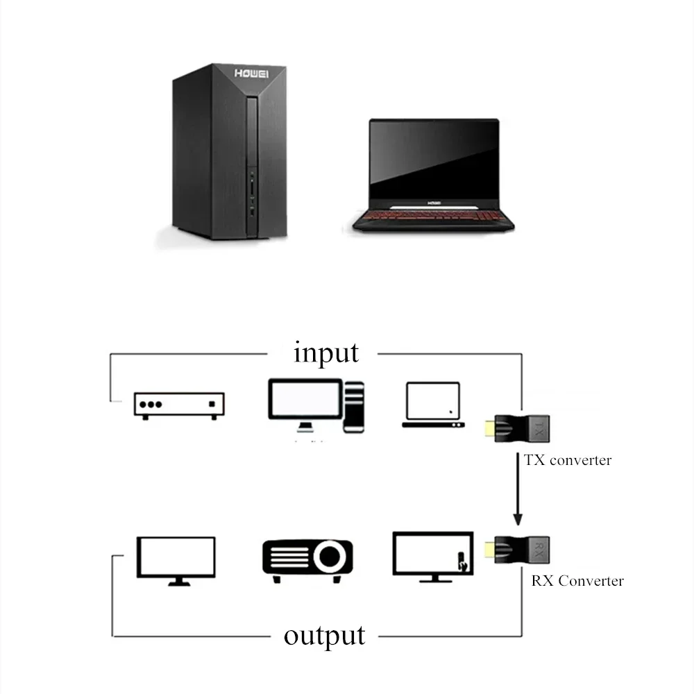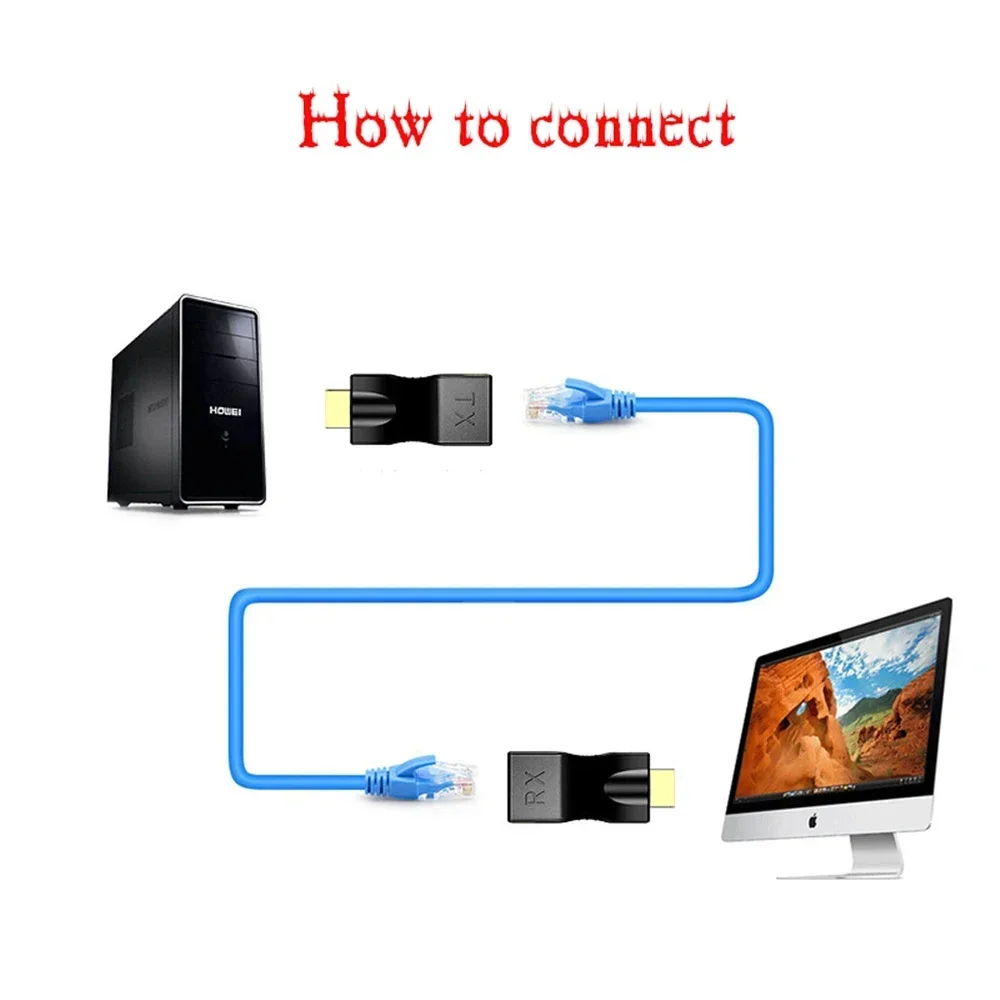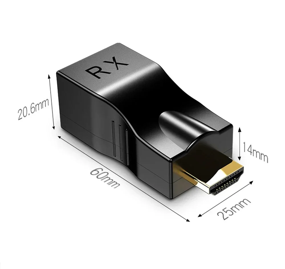 – HDMI удължителят се състои от предавател (TX) и приемник (RX). Чрез CAT-5/6 или по-висок клас меден кабел с усукана двойка, HDMI сигналът може да бъде предаден на разстояние от 1-30 метра, в реално време предаване с висока разделителна способност, вградена анти-мълниезащитна верига и анти-интерференция.