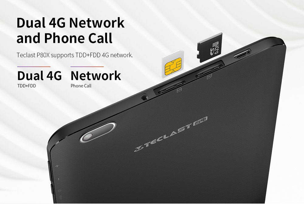 – Dual 4G мрежа и телефонни разговори: Teclast P80X поддържа TDD + FDD 4G мрежи, което ви позволява да провеждате телефонни разговори и едновременно с това да сърфирате в интернет.