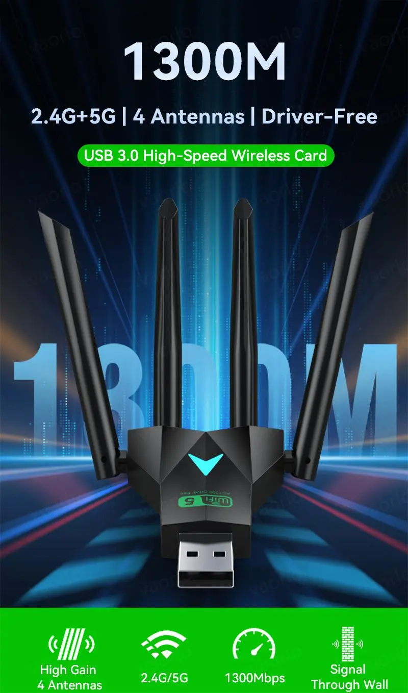 WiFi USB Адаптер 1300 Mbps 2.4G/5GHz WiFi Донгъл USB 3.0 802.11AC С 4 антени