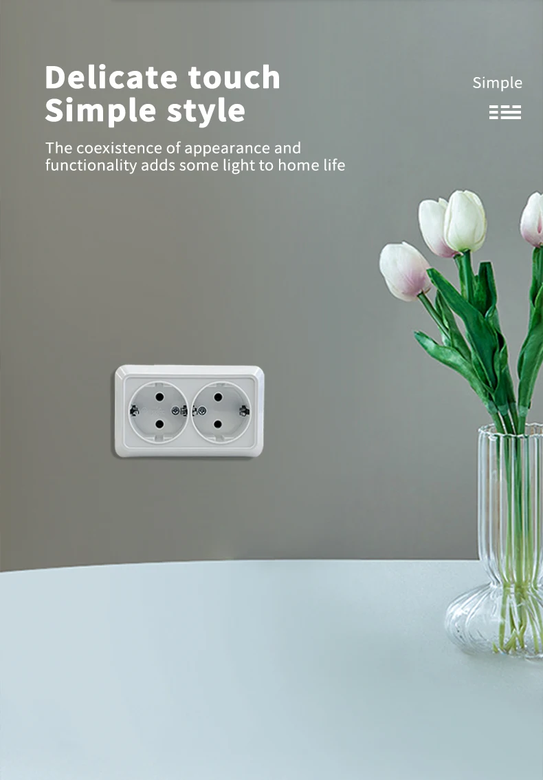 Двоен стенен контакт с ултратънък дизайн и противопожарен корпус. Изработен от висококачествени пламъкоустойчиви материали, контактът е устойчив на високи температури, статично електричество и механични удари, което го прави дълготраен и надежден. Контактът е подходящ за жилищни и общи приложения, с гладка повърхност, която е устойчива на замърсявания и следи от пръсти, осигурявайки елегантен и чист вид. Силната приложимост и здрава изработка гарантират безопасна и ефективна употреба за ежедневни електрически устройства.