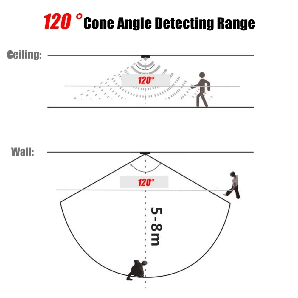 – Сензорът разпознава движение в обхват до 7 метра и ъгъл от 120°, като позволява регулиране на времето за изключване.