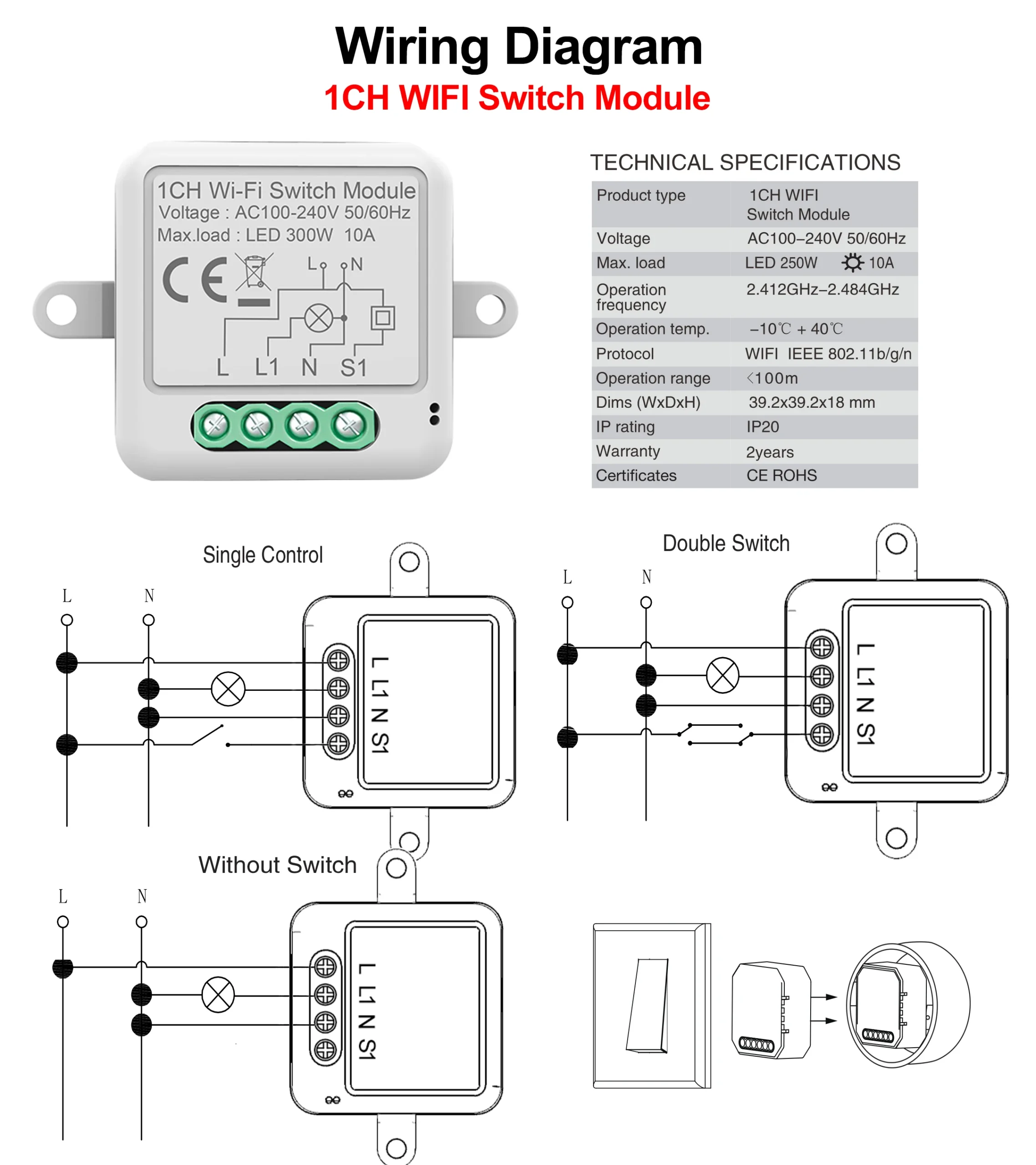 – Мини корпус: Размери 39.2 × 39.2 × 18 мм, подходящ за повечето монтажни кутии. Компактен, но мощен – може да се използва с повечето домашни уреди и осветление.